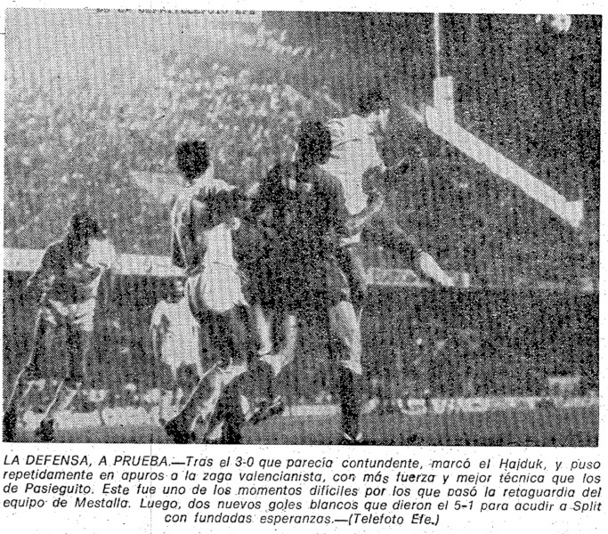 En el estadio Luis Casanova ha sucedido esta noche lo inesperado, algo verdaderamente insólito y sorprendente pero positivo paraa el Valencia. El Hadjuk Split ha pagado los vidrios rotos de la derrota que el Valencia sufrió el pasado domingo ante el Barcelona, encajando a su vez idéntico resultado, un 5-1 con el que prácticamente debe considerarse la eliminatoria resuelta. Es el caso que nadie daba una perra gorda por el Valencia después del tropiezo del pasado domingo en el Camp Nou, como culminación de una campaña en la que el equipo ni juega ni obtiene resultados. Hoy sólo ha habido media entrada y el público estaba de uñas con su equipo al que ha dedicado un recibimiento hostil, abroncándolo. Pues bien, el Valencia, en una gran actuación frente a un formidable equipo como es el yugoslavo, ha mostrado una calidad futbolística fuera de lo corriente, ha obtenido una victoria sensacional que le acredita como un digno aspirante a esta Copa de la UEFA, en la que indudablemente cabe pensar que llegará a los cuartos de final. Pues aunque el Hadjuk en su campo debe ser temible, es difícil que consiga remontar un tanteo de cuatro goles de diferencia. En fin, que el Valencia ha tenido hoy la noche de la revancha del Nou Camp, y ha podido brindarle a su hinchada una satisfacción completa.