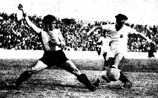 En el segundo tiempo, Bosch, que está jugando mueno, lanza un tiro bombeado, que pone en peligro la meta del Valencia por el acoso de los delanteros españolistas. Domina netamente el Español durante todo este tiempo. Prat pasa adelantado a Espada, y éste lanza un centro retrasado, que, recogido por Mandaluniz da en el poste, y el mismo Prat, muy oportuno, remata, consiguiendo de esta manera el empate a dos tantos.