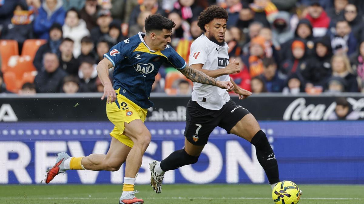 Al cuarto de hora del choque, llegó el primer tanto y fue Beltrán el que lo provocó. El argentino se retrasó para recibir y al no seguirle nadie, se giró y metió un incisivo pase al hueco por el medio que Hugo Duro, tras esconderse a la espalda de Cabrera, transformó con serenidad. La bronca de Dmitrovic a Calero por no encimar al sudamericano fue sonora y muy visual. El Valencia no marcaba en una primera parte desde septiembre y, tras trece jornadas yéndose al descanso sin gol, se gustó en ese guión. En cambio, Manolo González ya había puesto a calentar a casi todo su banquillo a la media hora de juego. El aviso de su técnico espabiló a los suyos, que se encontraron con una inesperada ayuda de los locales, a los que se les hizo largo el final de la primera parte y retrocedieron. El Espanyol retomó el dominio pero aunque amenazó con el juego aéreo, no concretó y un eficiente Eray Cömert neutralizó una internada de Carlos Romero por la banda al interceptar un pase atrás hacia Roberto Fernández.