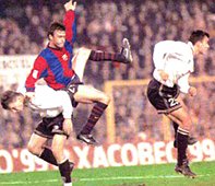 Para empezar, una dudosa caída de Rivaldo cuando pisaba el punto de penalti para rematar y Farinós le molestó. Pero el Barcelona, pese a abrazar el balón durante más tiempo, era incapaz de hacer daño. Llegó el Euromed valencianista. Primero el Piojo avisa con una falta directa que frustra Hesp. Pero pronto iba a recuperar su asesino contragolpe para ofrecérselo en bandeja a una afición enloquecida. Farinós pone el pase y Claudio López toca con elegancia.